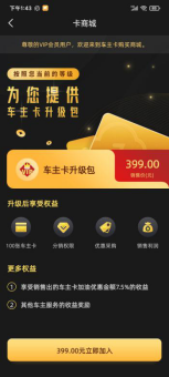 下载完成之后请打开“有车云”APP,升级为有车云分销商,在首页点击卡商城,如图,在打开的页面下选择-立即加入-并完成支付、信息填写等步骤。