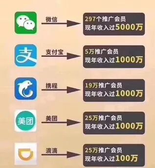 互联网是创造了很多的一个奇迹的,比如我们耳熟能详的美团滴滴携程拼多多微信贝壳等等,这些跟我们生活呢都是息息相关的一些网络工具,那用的时候呢,都跟我们有关系,但是挣钱的时候跟我们没有半毛钱的关系,对吗,但是我重点要提的是这些平台早期推广者,他都是赚了一个盆满钵满,进入了一个叫被动渠道收益的模式。