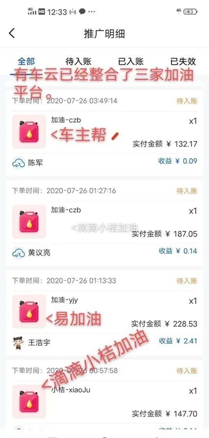 所以通过我们市场调查查看啊,同类的这样的平台,可以做到分享赚钱的竞品几乎是没有的,要么就是实力一般的第三方平台,有车云完全是处于开荒期,而且还是最早红利的第一批人,那可能大家知道在加油这一块呢,可能有些人知道叫团油、滴滴车主帮。