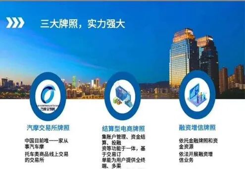 (3)有全行业的合法正规牌照(全国唯一的汽摩交易所牌照+互联网金融银行牌照+资金结算牌照);