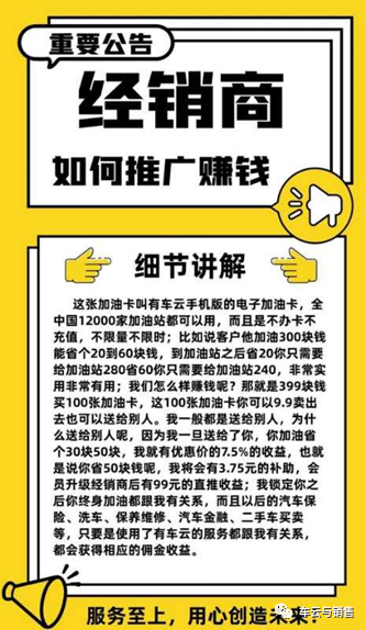 那第二个身份就是我们说的经销商啊,那也就是我们现在分享出来跟大家一起抱团挣钱的一个目的,那399呢,它可以得到的是100张优惠的车主权益卡,你是可以终身享有全网特价消费的一个折扣,你还终身享有的是推广权,那这100张卡呢,你可以送朋友,送亲戚,送家人送邻居送陌生人都可以,只要是车主他都有这个刚需,所以送加油卡,你的面子领子其实都是有的,因为人家不用去花钱呢,他每次加油他还给他省钱,他是很乐意的。