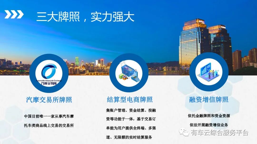 有车云而且拥有国务院颁发的汽摩交易所牌照,这个汽摩牌照目前在中国是唯一一家汽摩类商品线上交易所牌照,还有结算型电商牌照,以及金融增信牌照。
