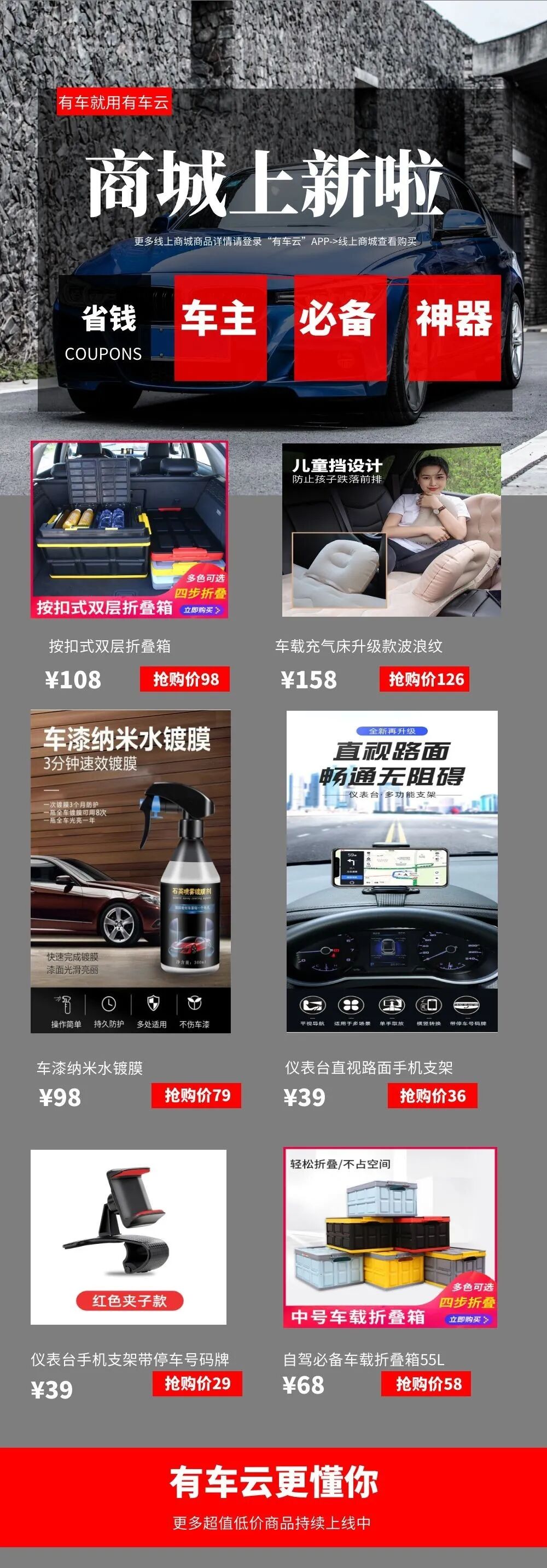 同时,有车云的门店搜索服务、保险咨询服务等功能,均是在全面考虑了车主消费场景需求的条件下设定的功能选择,便捷又省心。此外,有车云筹建提供了商户入驻的合作模式,与B端共享有车云平台中的流量红利。目前,有车云线上商城服务也已经上线,海量超值好货陆续上架中,车主们通过“有车云”APP端即可购买爱车配件、配饰等产品。