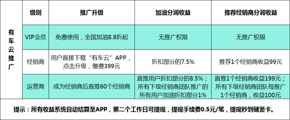 例:你的下级经销商累计推广3000个用户,每个用户月平均加油1500元,享受折扣部分约180元,180×1%×3000=5400元/月,就是你的团队累计分润收益;