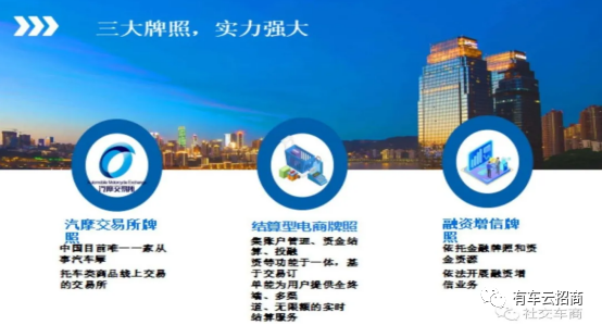 第二 短期内,有车云很难有竞争对手。做项目,最怕是今天刚做,明天同类项目就出来了。而有车云的产生是背靠车云数字科技股份有限公司的强大资源,也是渠道的资源,一是车云数科在汽摩交易领域,凭借着自由的交易结算系统,融合了加油站、银行支付等上下游渠道资源。一般的企业没有三五年的沉淀,很难把这么多资源揽齐在手里,二是牌照资源,车云数科拥有国内唯一的汽摩交易牌照以及金融全牌照,单凭这点,就几乎可以堪称是行业的寡头企业了。如果哪一家没有牌照也要来干这个事,那注定是在铤而走险。