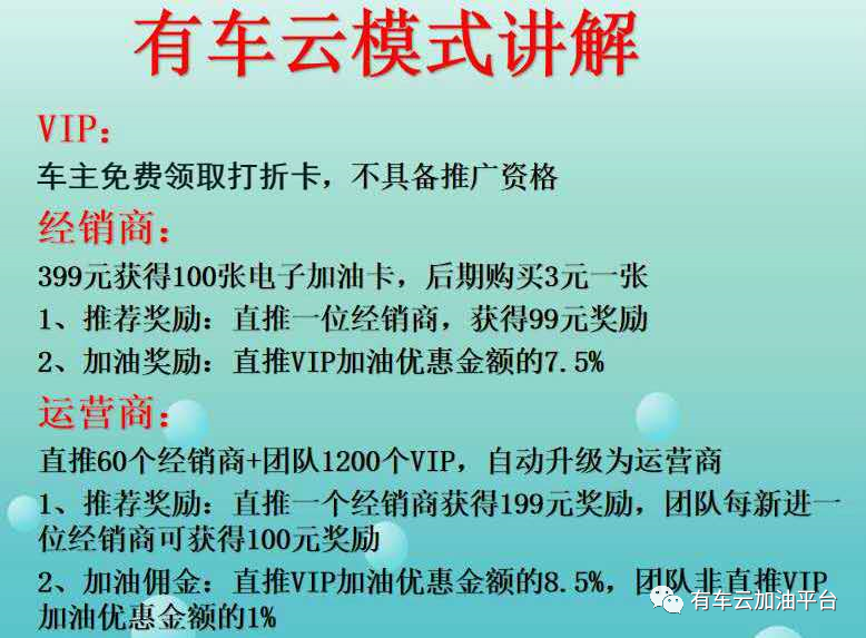 最后感招大家,如果你认准了,看懂了,就行动,唯有行动可以创造结果,其它一切都是浮云,399元购买100张卡获得有车云推广资格,即便你把卡全部送人,你也不至于亏本,因为在未来别人加了油你有收益,别人买了保险你也有收益,别人申请了金融贷款产品,你也有收益,马云说过,当你觉得一件事情可做时,就赶紧去做,万一成功了呢,没错吧?