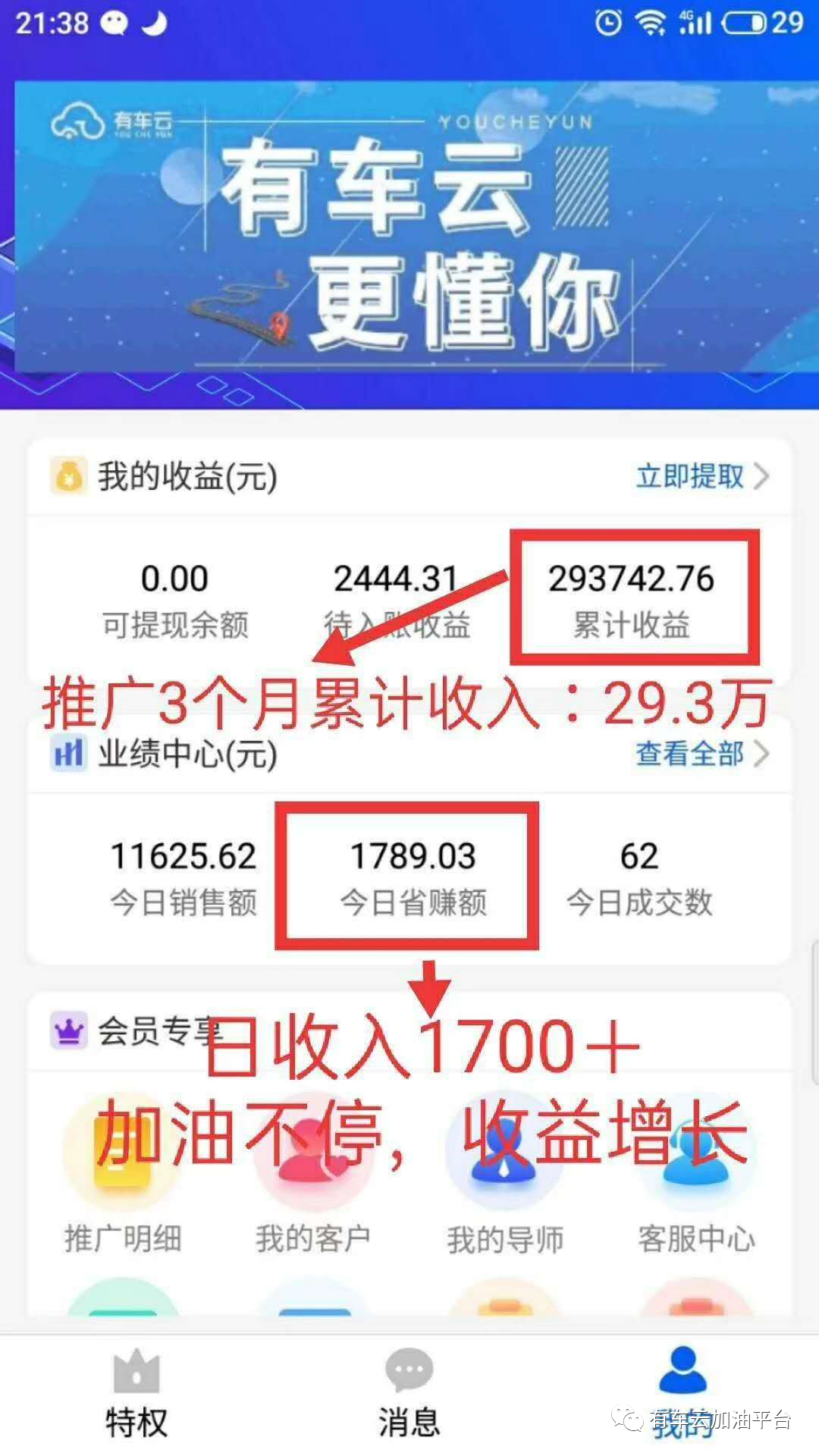 以上收益仅仅为只有目前的一款加油产品而产生的,换句话讲当你的营销网络足够大时,仅一款产品在有车云里你都可以获得很高的被动收益,而这些伙伴取得的这些成绩也只是在这三个月左右的时间里,有些伙伴只用了一两个月就能拿到运营商资格。