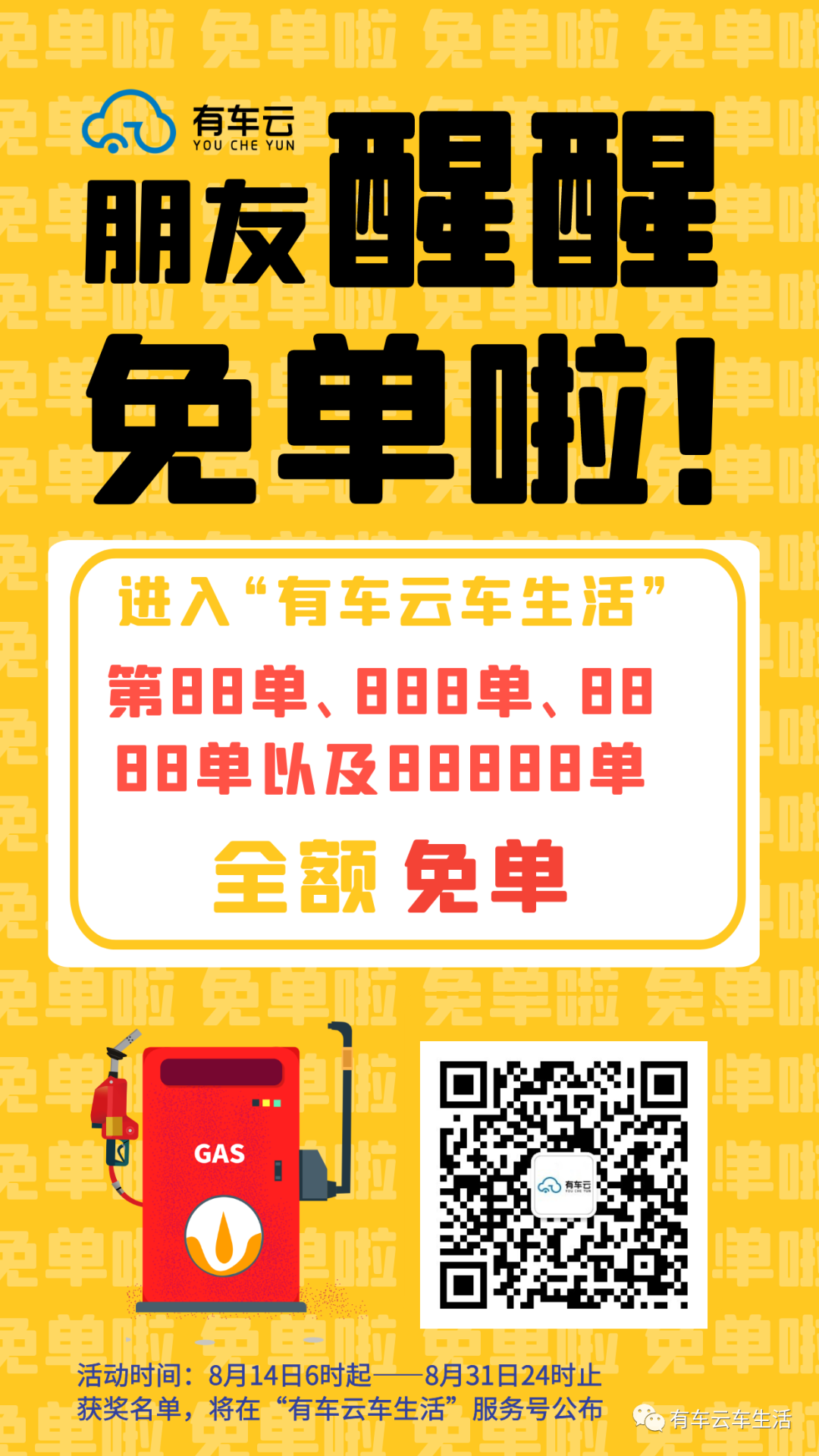 注:本次活动凡有车云用户皆可参与;用户可不限次数参与,凡订单排名在88单、888单、8888单和88888单车主,都可以享受免单(单笔封顶888元);本次活动最终解释权归有车云所有。