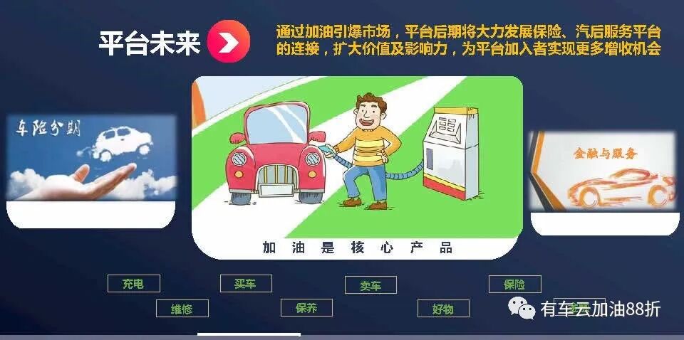 有车云通过为车主提供加油优惠、汽车用品、车主增值产品为基础服务,依托产业+资本的渠道和资源,集账户、数据、金融科技、社交流量为一体,赋能汽摩产业链,帮助商户快速引流获客,轻松地赚更多的钱,从而加快实现产业数字共享生态。有车云只是让我们多了一个选择,如果同等情况下有优惠,就选择它,如果没优惠,或者临时没有想到它,那就不用,有车云定位是做汽车消费领域的美团网。