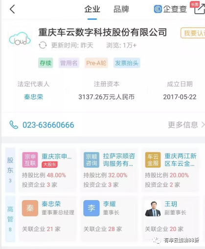 有车云运营主体叫重庆车云数字科技股份有限公司,简称车云数科。是重庆宗申集团直属的子公司!宗申集团是做摩托车起家,成立于1982年,业务目前已经遍布欧洲,美洲,中东,东南亚和非洲在内的150多个国家和地区。在全球拥有员工近万名。旗下有两家上市公司,银行,拥有全国唯一的汽摩交易支付结算牌照!金融全牌照,国外多个科研所,重庆巴南区2000多亩的宗申工业园,以及覆盖全国的经销商,物流和销售网络,形成了以产业金融和互联网三位一体的超大型集团!