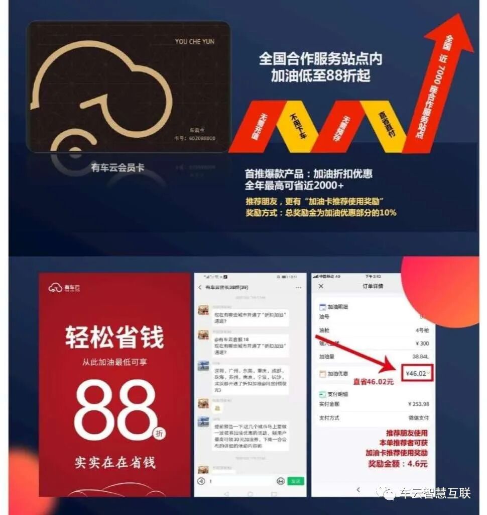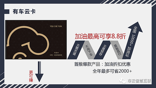 有车云的产品结构其实很简单,第一个爆款产品就是“车云卡”,使用“车云卡”加油可以享受折扣优惠!“车云卡”目前在全国近15000个加油服务网点均可以使用,不用充值,不需要预存,也不用下载APP,更不需要绑定行驶证,一年轻轻松松节省上千元的油钱!真正做到了,简单好用!只要激活成为会员,立即可以显示附近可用加油站的折扣优惠详情,“车云卡”可送可卖!当你每送出去或者卖出去一个“车云卡”会员资格,它都将会成为你财富的收益渠道,因为加油是刚需并且高频次的能源消费品,只要是你的会员加油消费就会为你带来源源不断的收益。