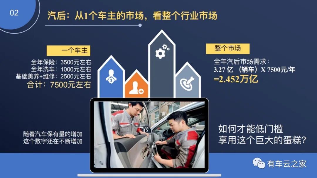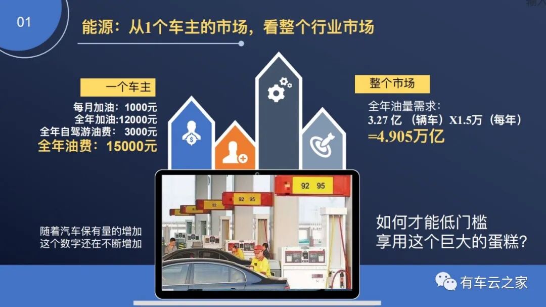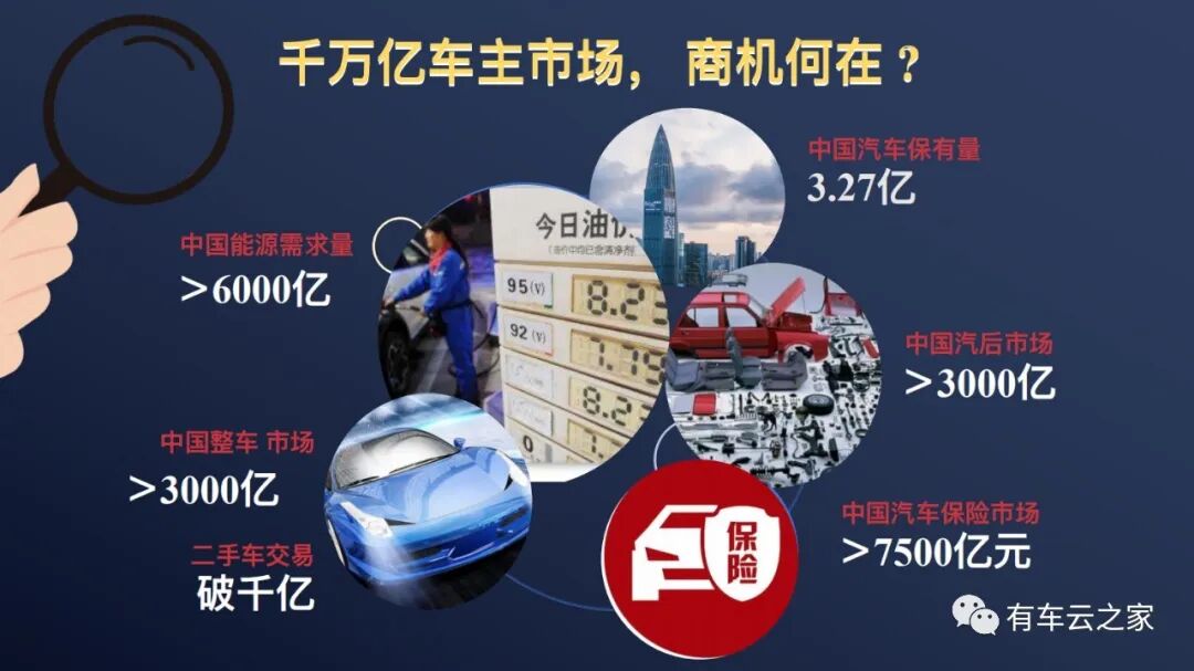 每一台车从销售一开始就进入了汽车消费链,汽车保险、加油、洗车、保养、二手车交易,每一样都是刚需;再普通的家庭每台车每年在保险,加油,保养等方面的消费至少都在2万左右,中国有3亿多的汽车保有量,每年至少6万亿的汽车消费市场,如果有车云在一年两年后能拿到10%的市场份额,每年将是6000亿的产值,再低调一点占5%也有3000亿的产值,今天用有好有车云这个工具就能够参与瓜分这些蛋糕,这样的机会他不香吗?