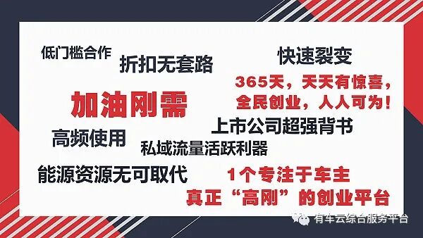 中国目前已经到了一个产品同质化程度极高的一种状态,无论你卖什么,能代替的同类产品都十分普遍。尤其是像服装,化妆品,保健这样的行业,很难再吸引到客户,因为实在太多了!但有车云的入门产品选择了全国可用且刚需,几乎无竞争的能源产品!单凭这一点就甩掉了足够多的竞争对手。因为要拿到能源产品,不是谁都能复制。没有技术,没有资源,没有渠道,是完全不可能做到的,但有车云做到了!更重要的是,能源产品是每一个车主的刚需,也是持续消费的产品!所以你可以很轻松的获得客户!也能很轻松的让客户接受你的产品,因为加油省钱,是实实在在为车主创造价值,大家都懂,大家都需要,所以推广起来非常的容易!