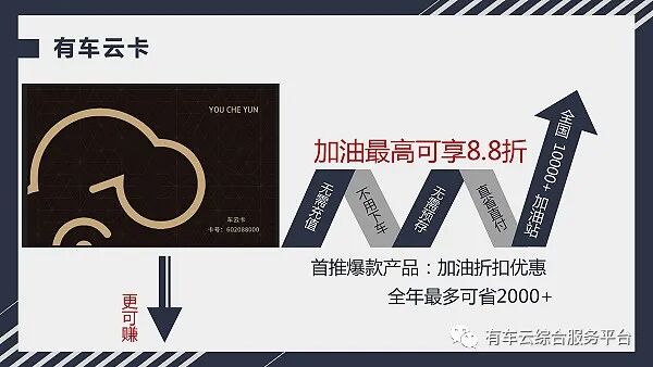 有车云的产品结构其实很简单,第一个爆款产品就是“车云卡”,使用“车云卡”加油可以享受折扣优惠!“车云卡”目前在全国近9000个加油服务网点均可以使用,不用充值,不需要预存,也不用下载APP,更不需要绑定行驶证,一年轻轻松松节省上千元的油钱!真正做到了,简单好用!只要激活成为会员,立即可以显示附近可用加油站的折扣优惠详情,“车云卡”可送可卖!当你每送出去或者卖出去一个“车云卡”会员资格,它都将会成为你财富的收益渠道,因为加油是刚需并且高频次的能源消费品,只要是你的会员加油消费就会为你带来源源不断的收益。