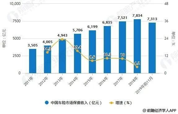 2011-2019年前11月中国车险市场保费收入统计及增长情况