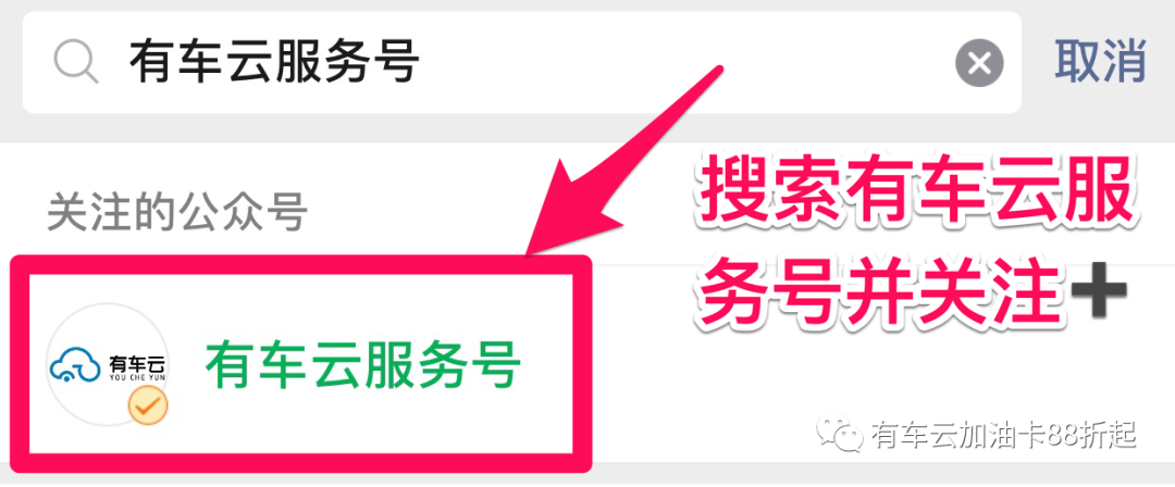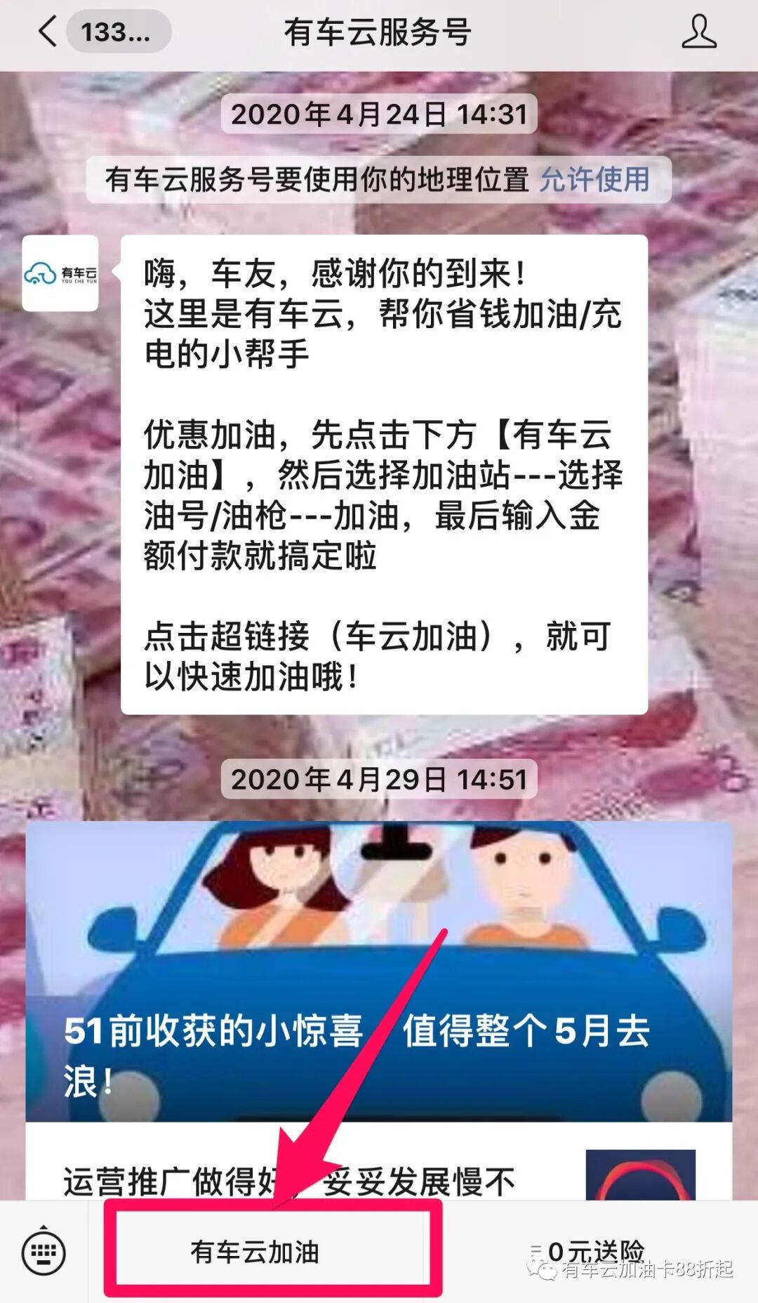 第三步:打开公众号,左下角的“有车云加油”进入加油页面