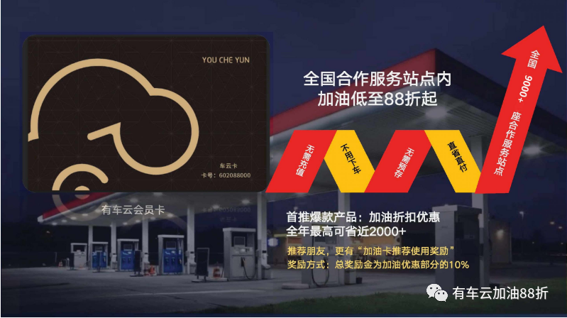 第一阶段用加油优惠折扣权益作为吸客爆品来构建汽车消费领域的私域流量池,因为加油是刚需产品,且高频持续消费的产品,有车就得加油,经过这几个月的时间证明了有车云确实是做对了,而且做到了,目前在全国已经合作了13000多所加油站,后期还会持续增加,有车云加油吸引客户的地方就是不需要充值,也不需要预存,也不需要绑定任何证件,更不需要下APP,直接在公众号里即可完成加油和支付,加油的价格还能最低8.8折起;但实际上有些地方价格还低于了8折,当然也有的地方优惠比较少,毕竟油品不是白菜,价格和品质受国家严格管控,各个地区各个品牌间都会有价格上的差异,但作为车主来讲,直接省钱是实实在在享受到了的,用得多的车主一年省一两千元甚至更多,最重要的是这么大的福利每一个用户都可以用超低的成本获得,只需找邀请人购买一张官方建议价9.9元的会员卡即可享有以上优惠权益,那会员卡值不值呢?加一次油就省回来了,对用户来说是没有任何风险的。