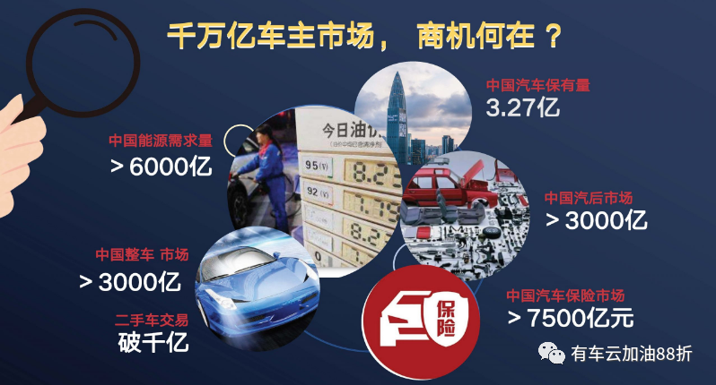 每一台车从销售一开始就进入了汽车消费链,汽车保险、加油、洗车、保养、二手车交易,每一样都是刚需;再普通的家庭每台车每年在保险,加油,保养等方面的消费至少都在2万左右,中国有3亿多的汽车保有量,每年至少6万亿的汽车消费市场,如果有车云在一年两年后能拿到10%的市场份额,每年将是6000亿的产值,再低调一点占5%也有3000亿的产值,今天用有好有车云这个工具就能够参与瓜分这些蛋糕,这样的机会他不香吗?