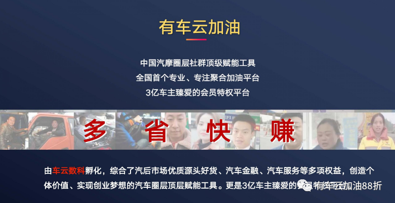 最后感召大家,如果你认准了,看懂了就行动,唯有行动可以创造结果,其它一切都是浮云,399元购买100张卡获得有车云推广资格,即便你把卡全部送人,你也不至于亏本,因为在未来别人加了油你有收益,别人买了保险你也有收益,别人申请了金融贷款产品,只要旗下的会员使用了服务都是有相对应的佣金收益!