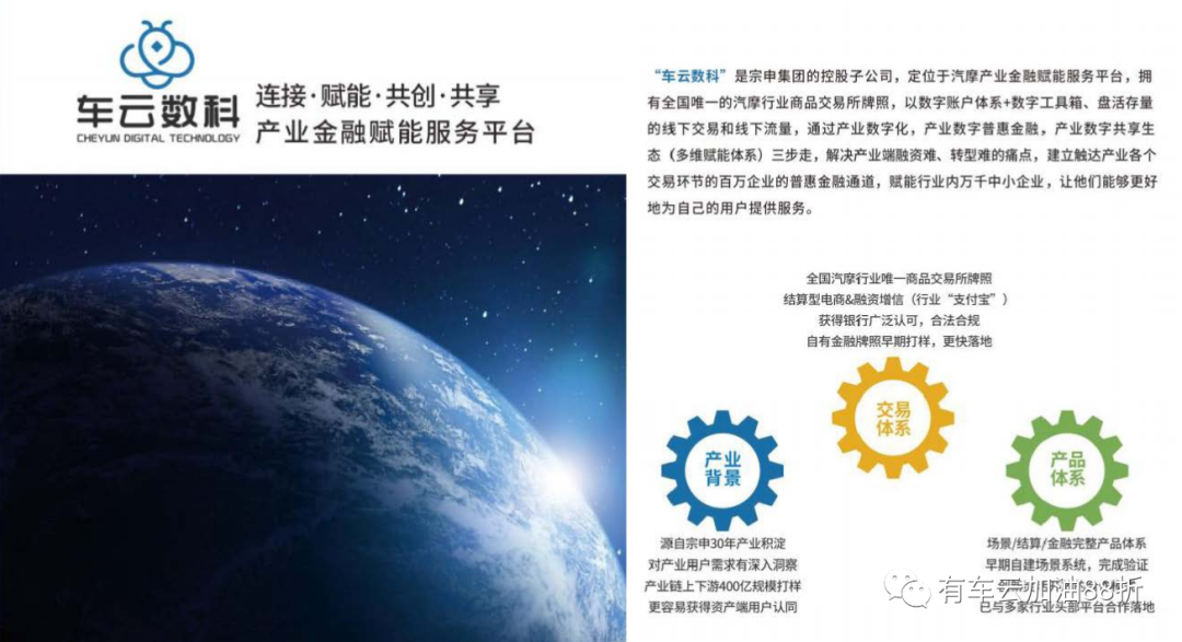 做项目最怕是今天刚做,明天同类项目就出来了,而有车云的产生是背靠车云数科公司的强大资源,一是渠道资源,车云数科在汽摩交易领域凭借着自有的交易结算系统融合了油站、银行、支付、保理等上下游渠道资源,一般的企业没有三年五年的沉淀很难把这么多的资源揽齐在手里,二是牌照资源,车云数科拥有国内唯一的汽摩交易所牌照以及金融全牌照,单凭这点就几乎可以堪称行业的寡头企业了。