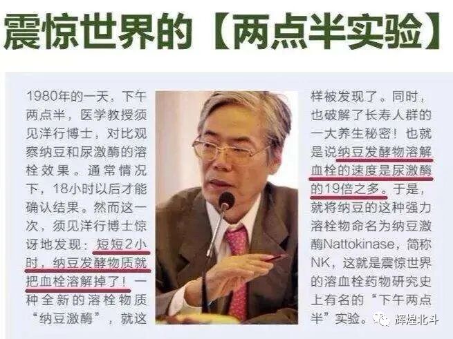 第二个成分是纳豆激粉: 纳豆起源于中国,被鉴真和尚带到日本。 1980年的一天。日本心脑血管专家:须见洋行博士做了世界上著名的实验,叫两点半实验。把纳豆激酶放在人造血栓中,不到三个小时发生了奇迹。血栓居然溶解了。在日常生活中一旦心脑血管发生到医院常用的是尿激酶溶解需要二十四小时。由于纳豆属于食品,所以纳豆激酶既没有药物毒副作用,又能实现对血栓的急速强效的作用,被誉为血管的清道夫。这也是为什么至宝多肽中加入这个成分的原因——迅速的分解血栓的核心物质纤维蛋白。以上两个食材虽然价格贵点儿,但是也能买到,而且市面上有很多溶解血栓的产品也是采用了这些有效成分。