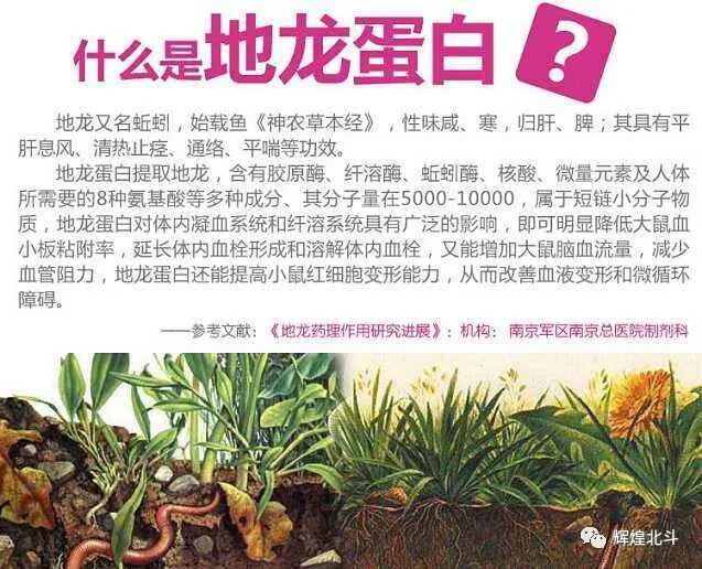 成分一、地龙蛋白: 有活血化瘀,通经活络的作用。因为他生活在土壤里不断前行。形成蚓激酶时我们的经络、血管儿有疏通的作用。可以快速的抗血凝,分解血液垃圾。