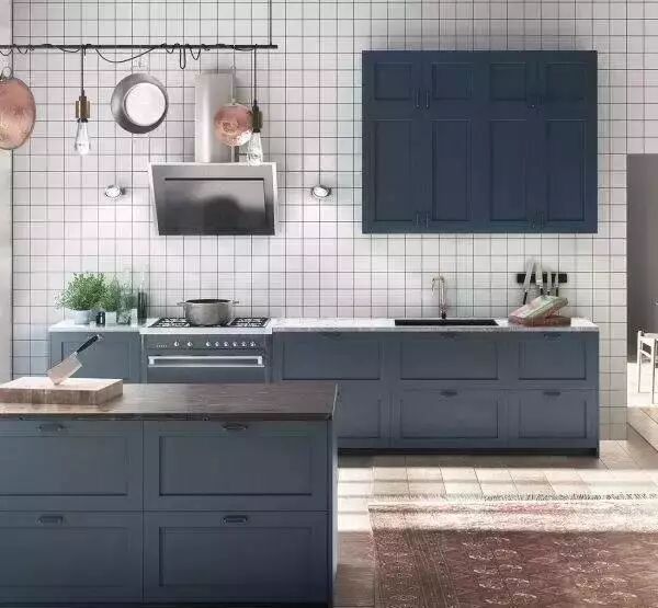 蓝色橱柜也很常见,但绝不是辣眼睛的荧光蓝,而是深蓝、蒂芙尼蓝,浅蓝,这些都是适合橱柜的颜色。