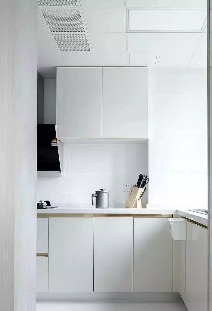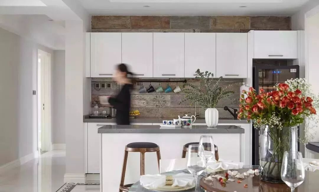 纯白可能有些单调,这个时候可以用局部亮点来点缀:餐具、台面、电器、花卉都是搭配利器。后挡板也有无限创造性,大理石,花砖、马赛克……你想得到的都可以用得上。