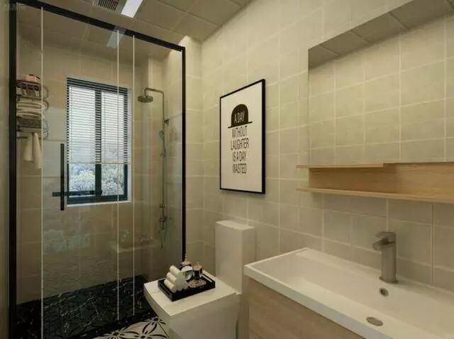 卫生间黑白的花砖,青灰色仿古暗纹墙砖,原木色的洗手台配上黑色地面的淋浴房,干净又舒适。