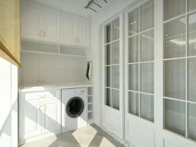 阳台灰色地砖搭配白色小暗纹墙砖,营造空间感,白色的洗衣台,空间最大化的合理利用。喜欢北欧风的不要错过啦!
