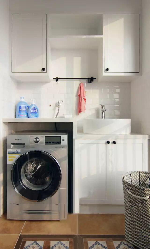 阳台把洗衣机嵌入到洗手盆柜内,同时洗手盆上方还装了收纳柜,整体白色调中以黑色点缀,显得优雅大方又高档。