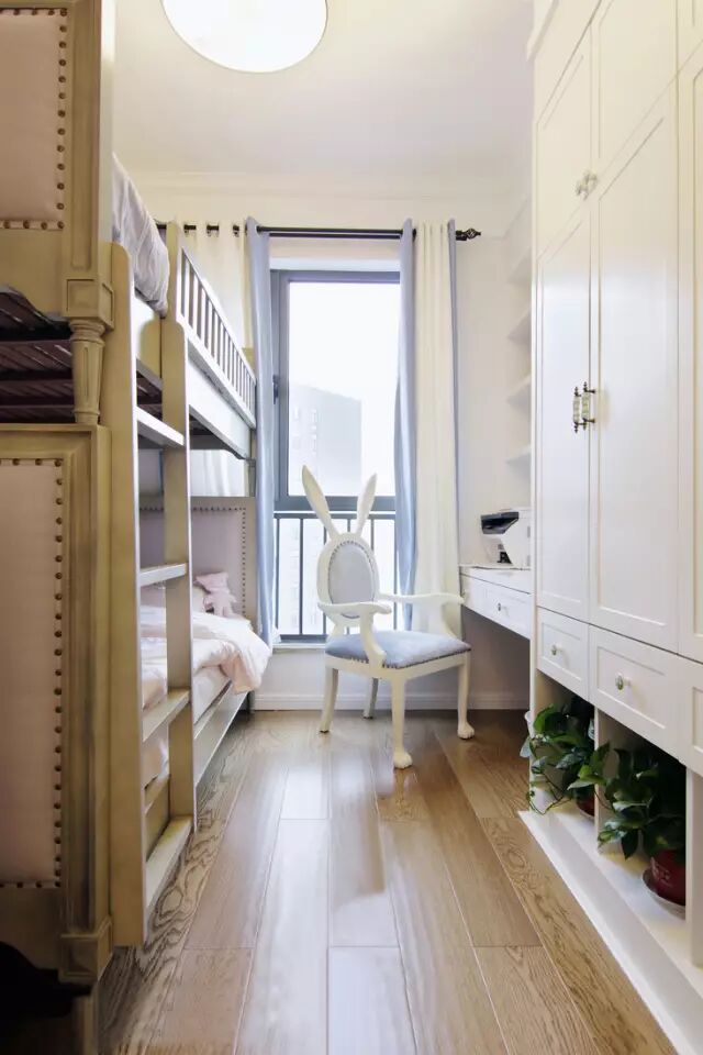儿童房采用上下铺,同时还布置了一张衣柜组合的书桌,方便小孩子学习使用;而衣柜底部的开放式的收纳,后期可以摆孩子的玩具,目前则是摆着清新的绿植,惬意精致;