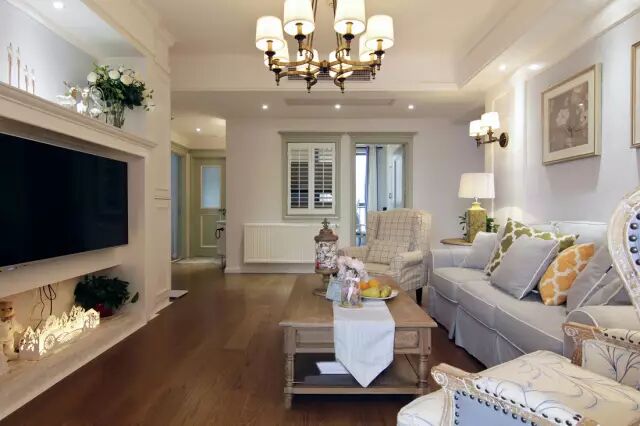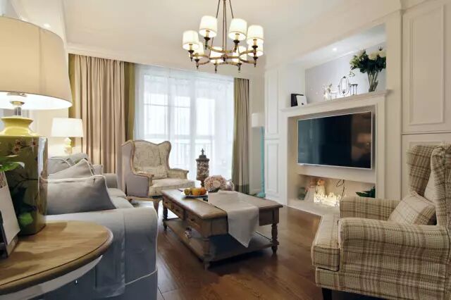 客厅电视墙装了个小壁炉造型,上边与下方都摆上精致的摆饰,结合优雅的线条框架,整体充满了优雅的气息;复古实木茶几,结合优雅的现代美式布艺沙发,显得低调奢华又华丽大方;