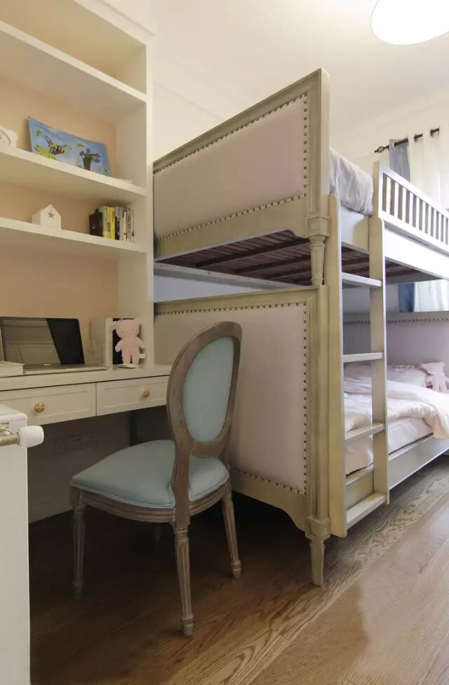 而在床尾这边,也同样布置了一个书桌位置,让儿童房可以同时满足2个孩子的使用需要;