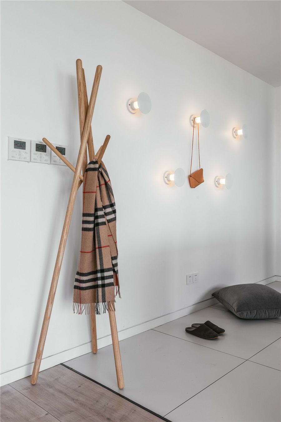 门厅没有传统的玄关柜或是鞋柜,只放置了一个挂衣架和墙面上5个精致的可挂物件的壁灯。平时出入时可将外套、包包挂在上面,很实用,而且不给门厅任何压抑感,清清爽爽,干净利落。