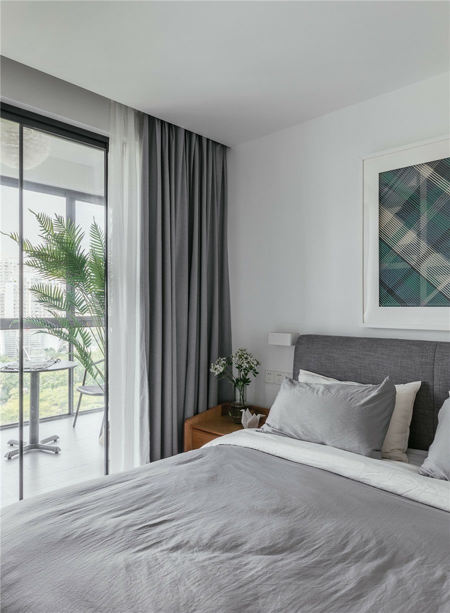 灰白色系为主调,以温婉柔和的光彩诠释着南方水乡女性独有的气质,岁月为伴最为动人。挂画的色彩与伸展的姿态,与阳台的凤尾竹摇曳散开有着异曲同工之妙,空间充满柔化安定的美感。