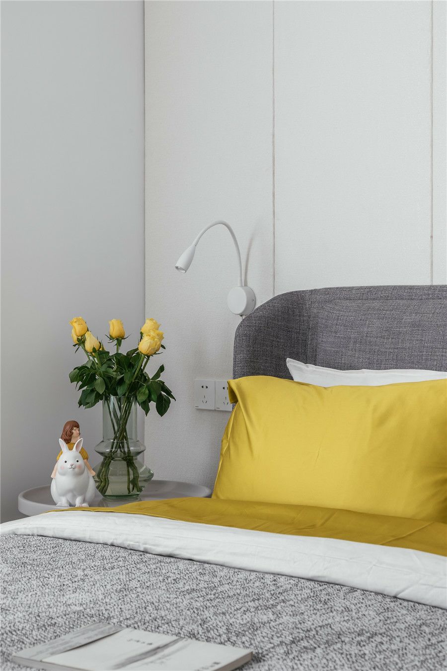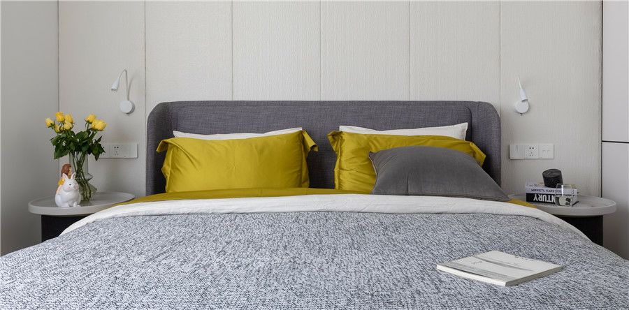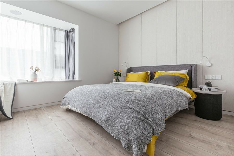 木色地板、灰色床组、奶白色硬包、反挑灯带、L型飘窗,在沉稳的色调和用材之下,姜黄色的床品和黄玫瑰在室内点缀,烘托着居家的暖意,让居住者在令人心神安定的氛围中,感受到家的方向,也享受着家的温馨。这是家带给我们最迷人的地方。