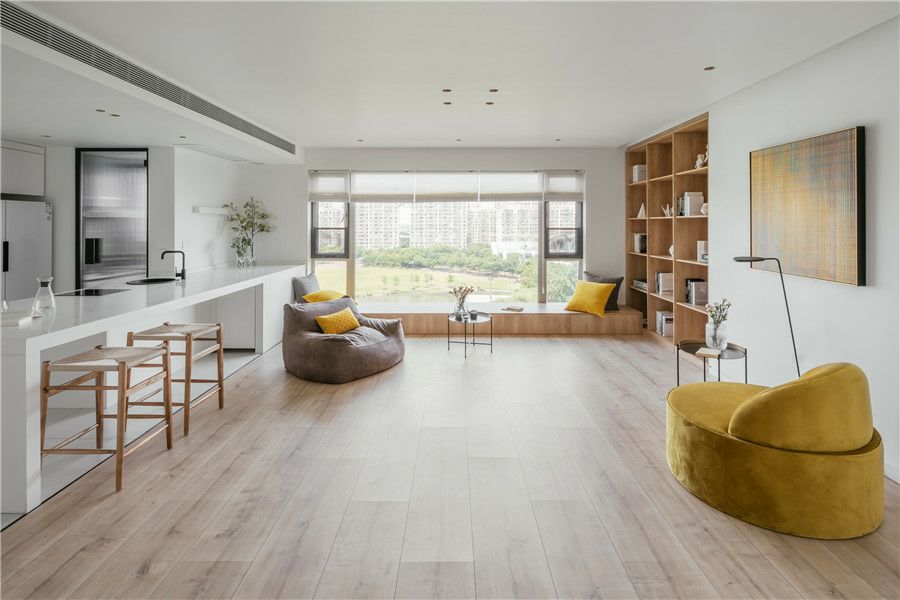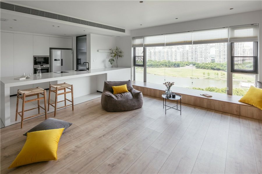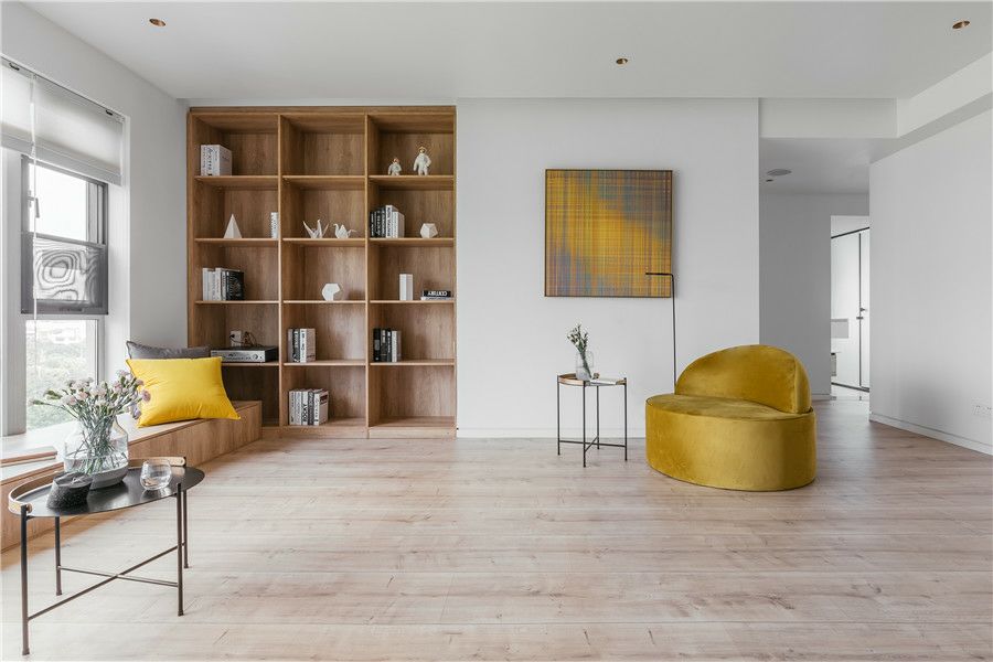 一眼望去,偌大的客厅空空如也。设计师跳脱了传统客厅的定位和布局,除去电视、多人沙发组,以超大落地窗、加长地台的形式,通过所有可自由移动的家具营造出轻松、不受拘束的宽阔空间。造型简约的茶几搭配木色、亮黄元素,更添自然、清新、活泼之感。