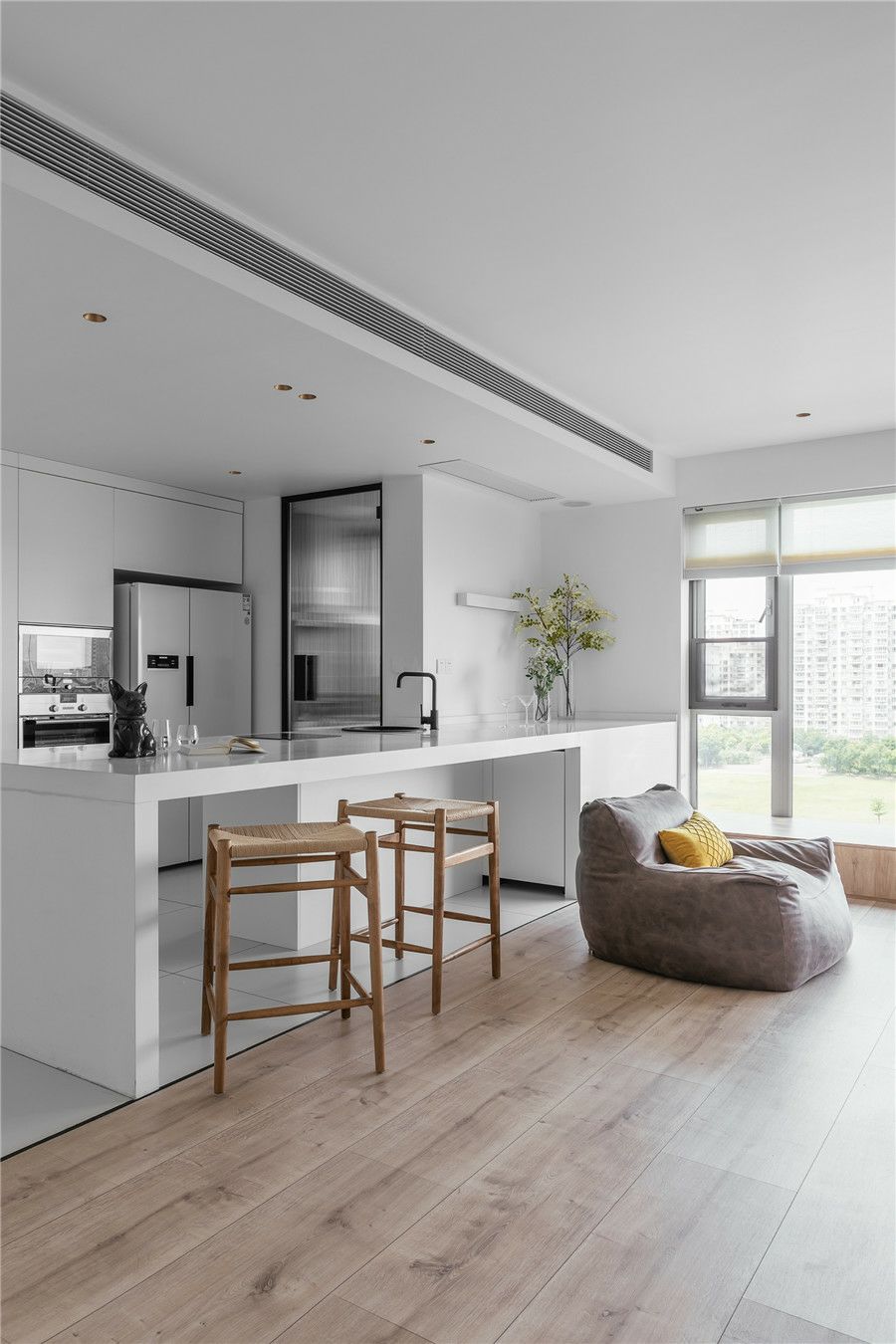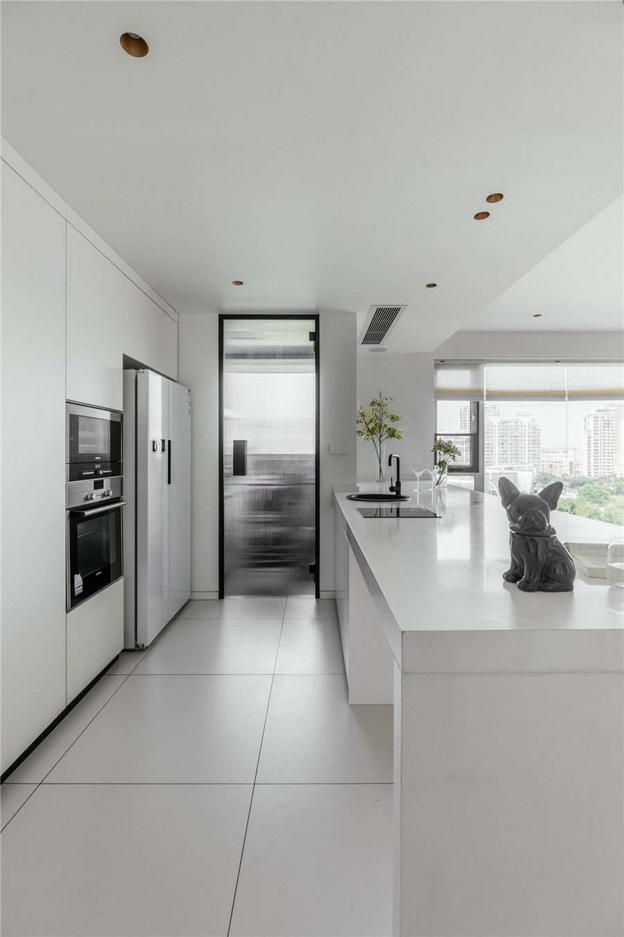 转向凝目,白色大理石的中岛吧台笔直延伸,引导出流畅的生活动线。厨房的超高长虹玻璃门将空间的线条拉伸,通透的质感也让自然光线洒满西厨和玄关的区域。高挑纤细的线条婷婷而立,纯白与黑色的经典组合奠定现代极简的基调。
