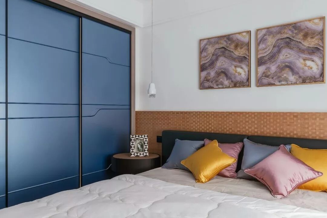 ▲次卧的衣柜同样采用蓝色的门,床头摆了一套极简的梳妆台上布置着精致的摆饰,搭配一张素黄坐垫+黑脚的小椅子,令空间显得格外的禅意端庄。