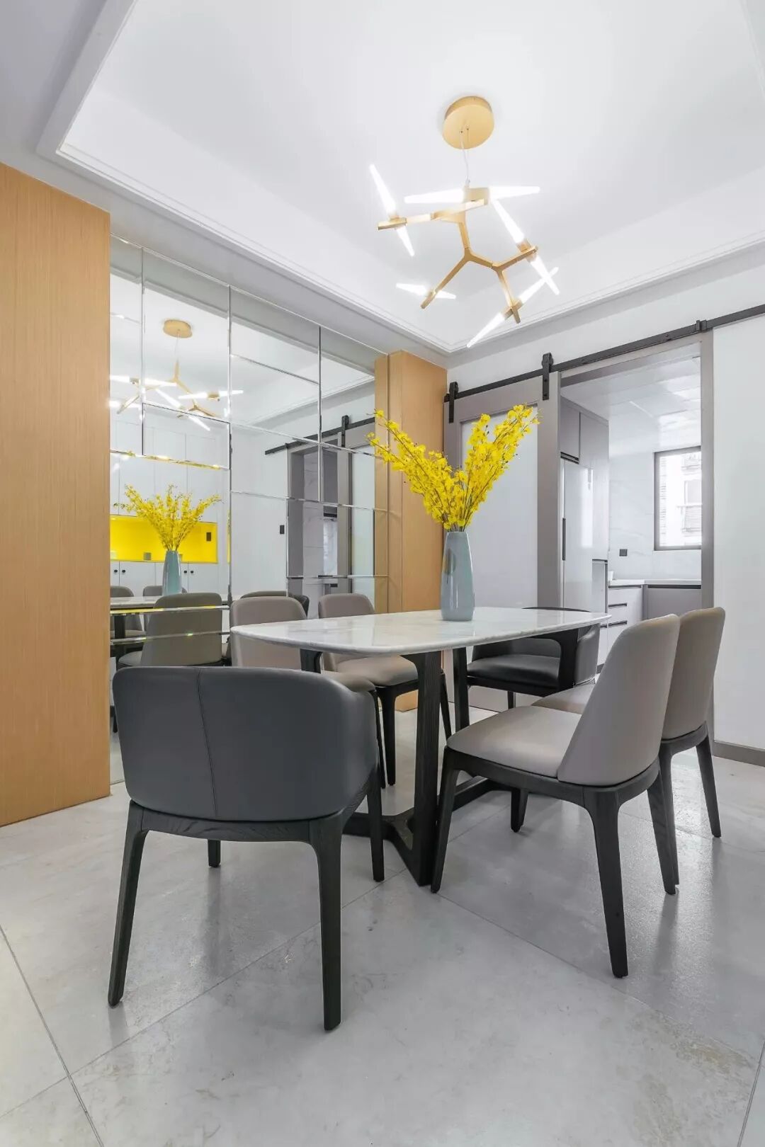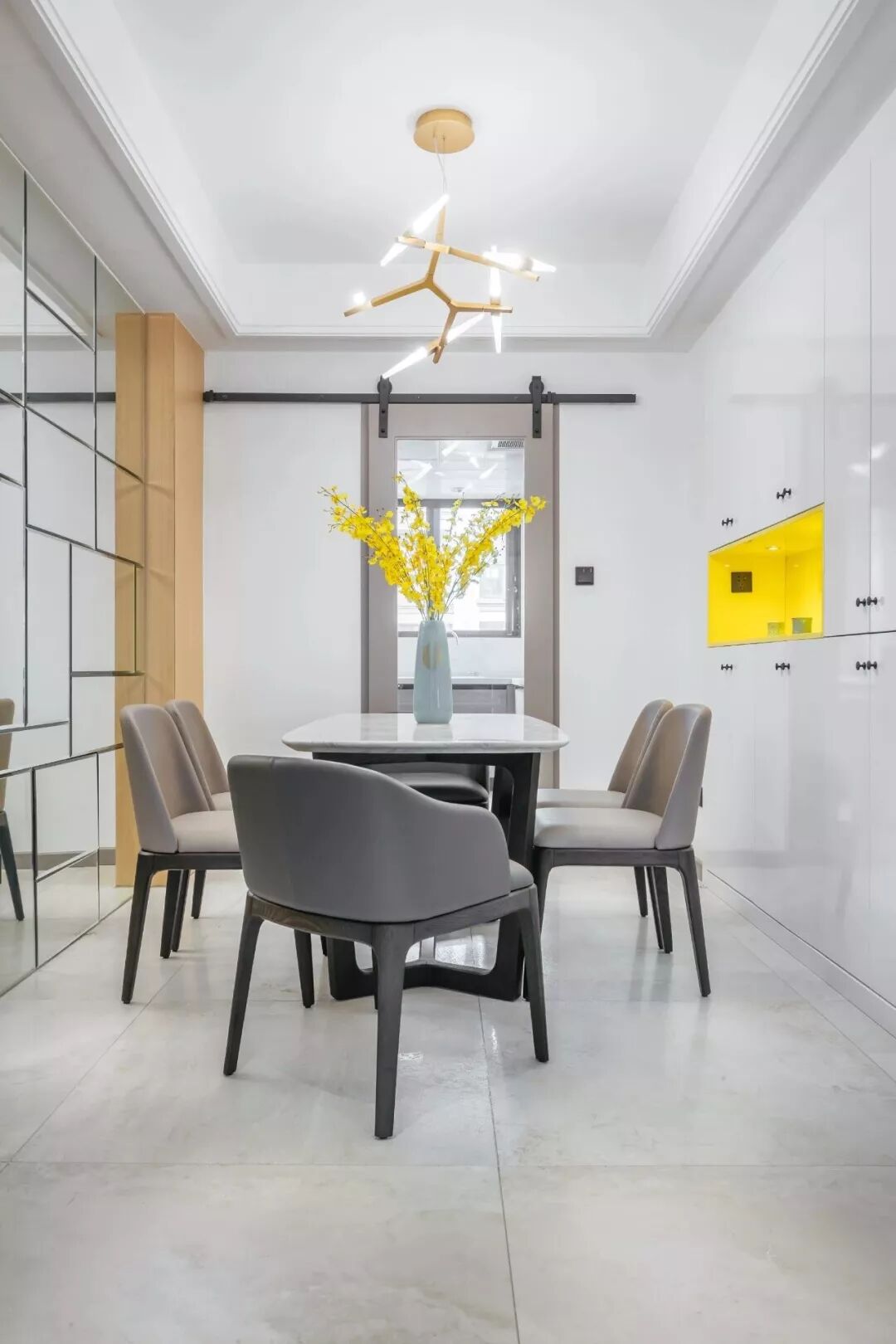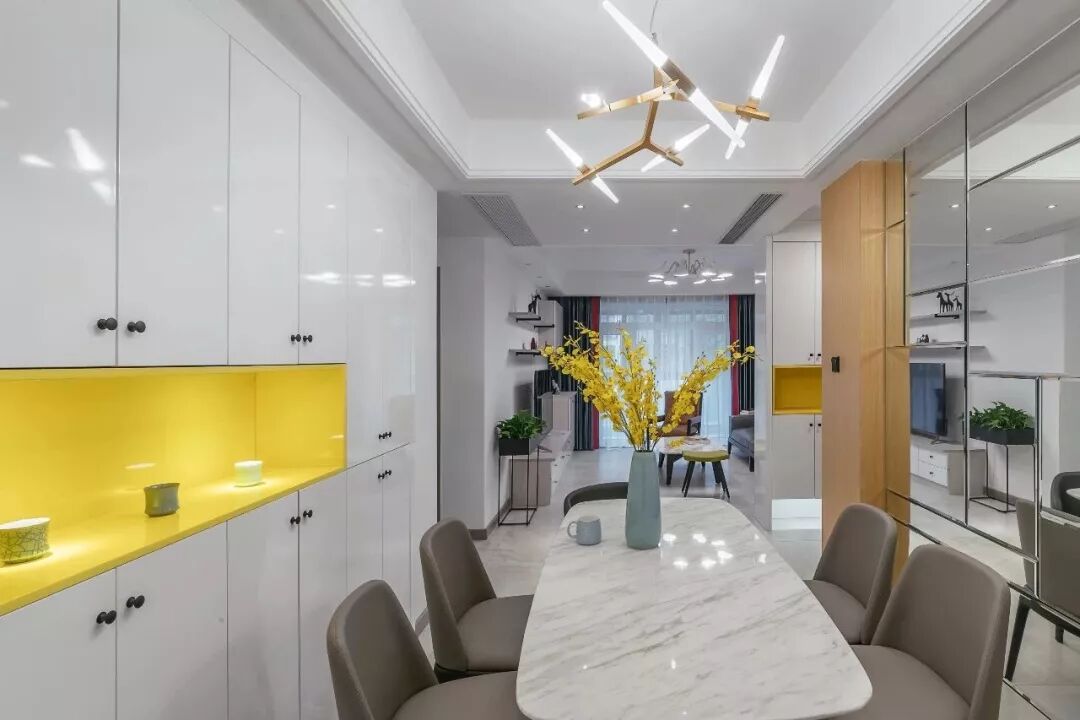 ▲餐边柜也是一个跟玄关柜类似的通顶组合柜,中间留出一个空格以黄色为主体,大理石质感的餐桌上布置一瓶的跳舞兰,整个视觉效果显得格外的温馨精致。