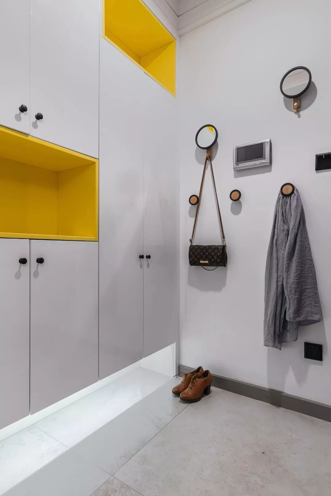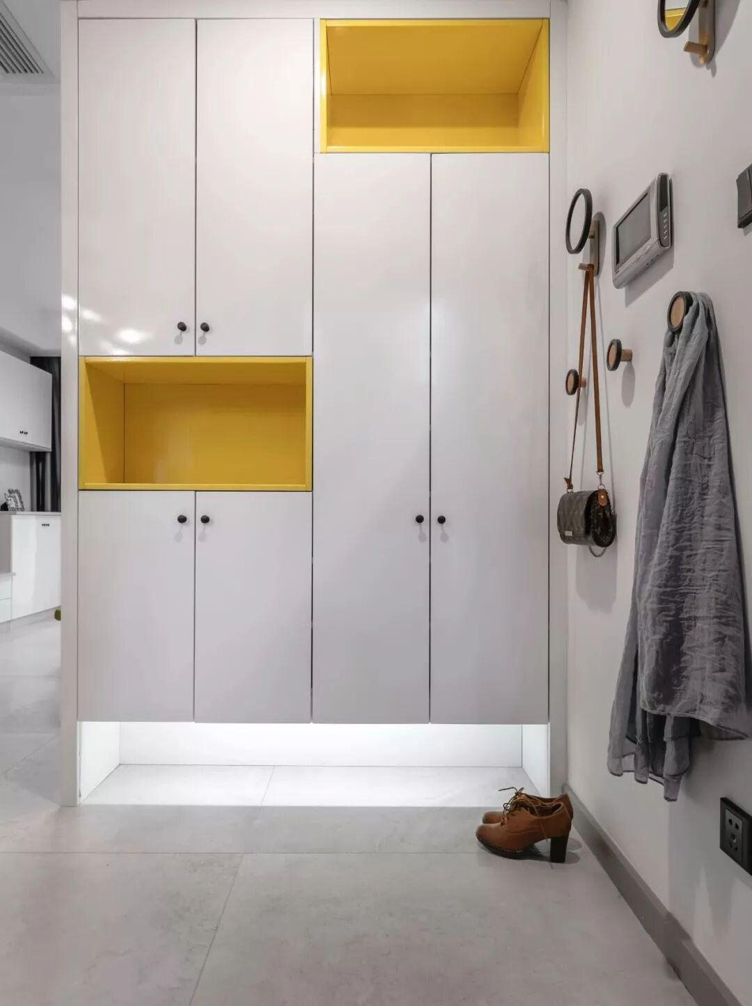 ▲整体白色的鞋柜里嵌入了2个黄色的开放展示柜,一开门就让人感受到一股活力自然的气息。