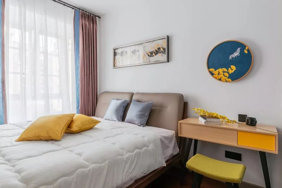 ▲床头梳妆台上方还挂了一幅圆形蓝色+菊黄的装饰画,结合上整个素锦软装搭配的空间,显得格外的优雅端庄。