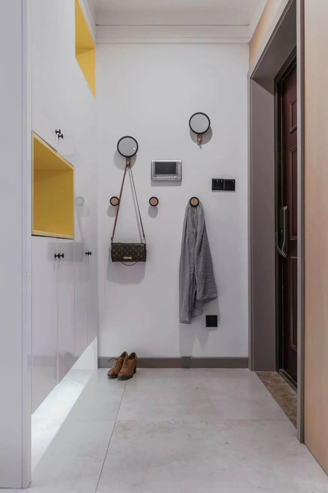▲进门后的小玄关,以浅灰色的地砖,门后的墙面上装上一组的创意挂钩,开关面板跟可视对讲机穿插在中间,显得这些美观而精致。