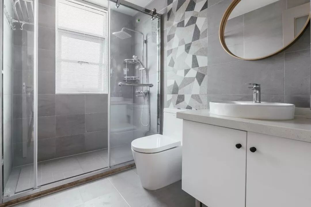 ▲卫生间区域整体也是以灰色调的空间为主,圆形的镜子、碎花图案的墙面,让这个卫生间显得格外的简约时尚。