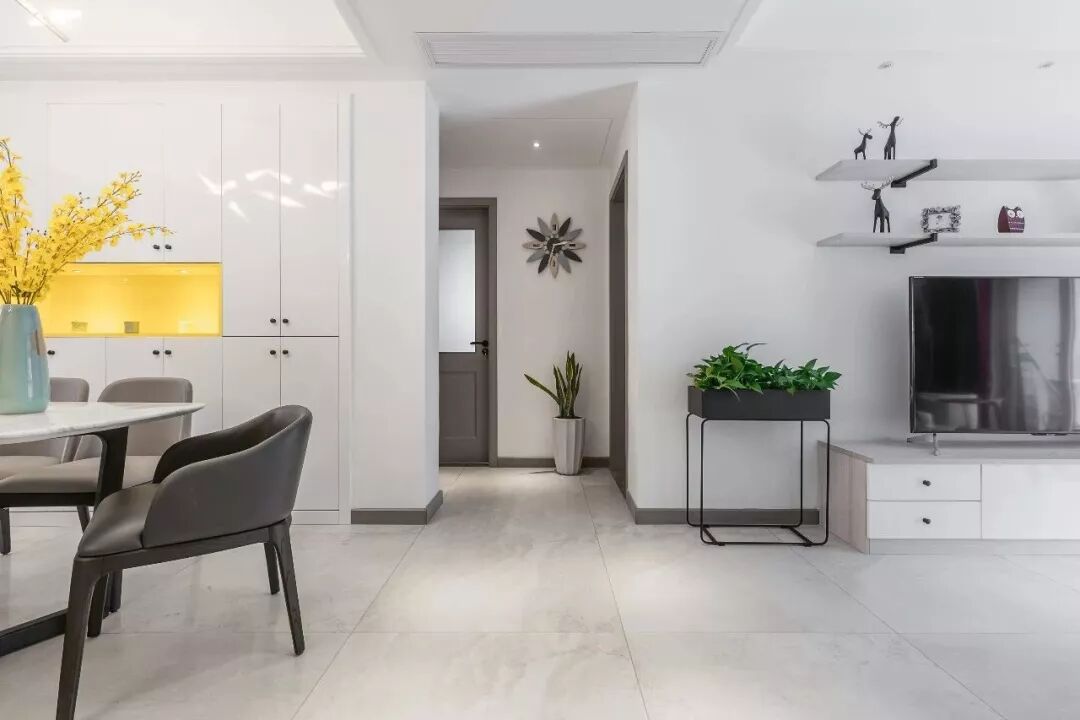 ▲客厅与餐厅连贯的空间,电视墙与餐边柜之间开个洞作为走廊,在走廊角落摆一盆绿植与一个装饰造型挂在强化桑,小小的细节足见主人对生活品质的高追求。