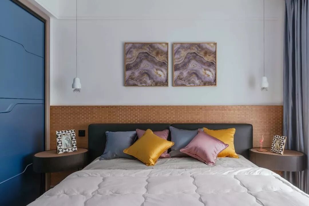 ▲卧室区域床头靠背区域做了靠垫,两侧对称的床头吊灯、圆形床头柜,还有中间2幅独特图案的装饰画,装出了一个独特的空间美感。