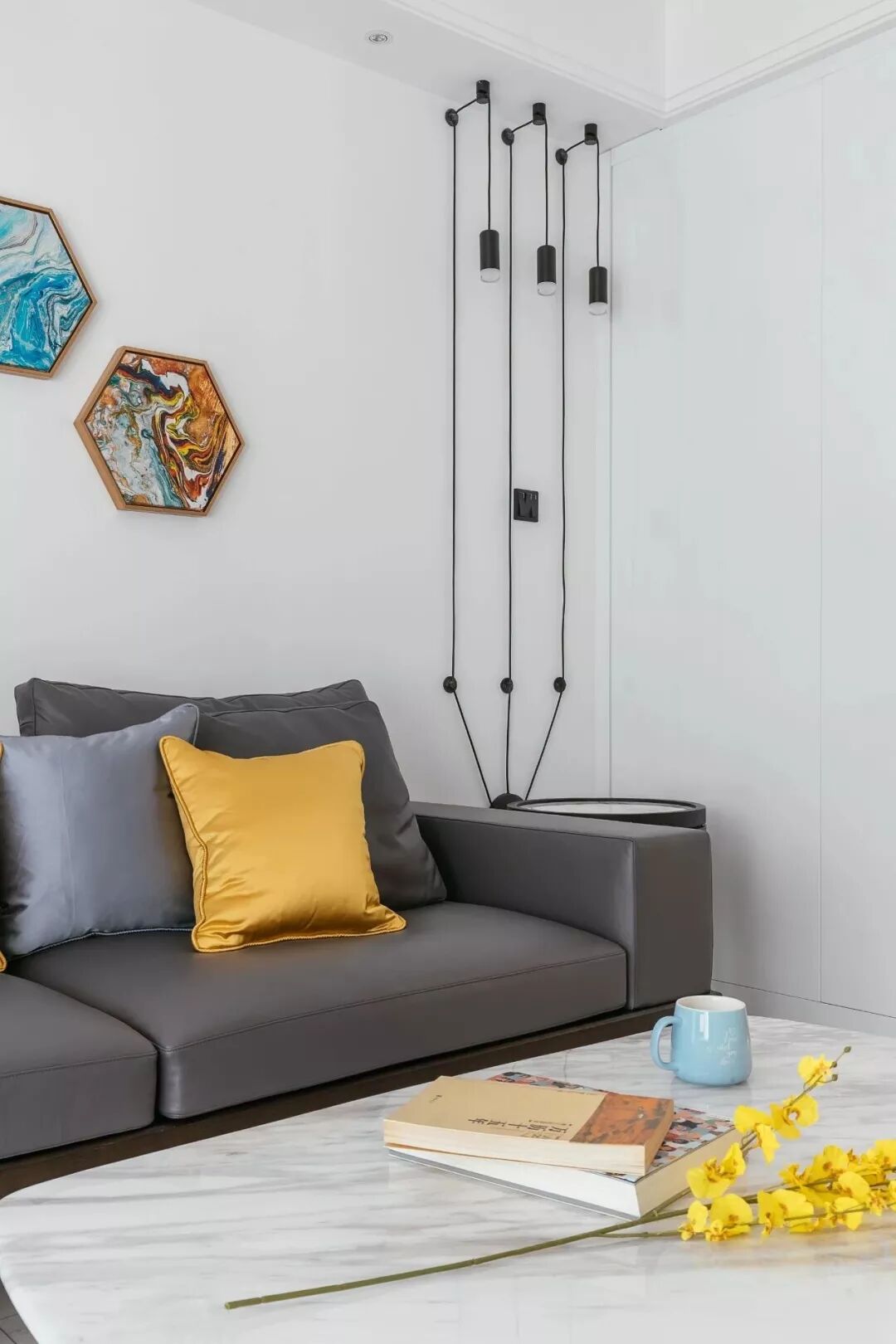 ▲沙发侧边的边几上方,以裸露的黑色电线到顶装了一组的吊灯筒灯,大大方方的美感,也是格外端庄。