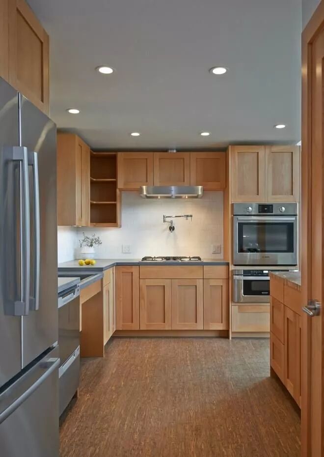 实木整体橱柜,纯实木的材质打造了它清新雅致的外观,纯实木是硬度和密度都很高的白橡木,它本身的防水性是其他任何材料所无法睥睨的,用来做橱柜最好不过,简约而又不失沉稳大气!在这样的厨房环境下做饭真的是一种享受~