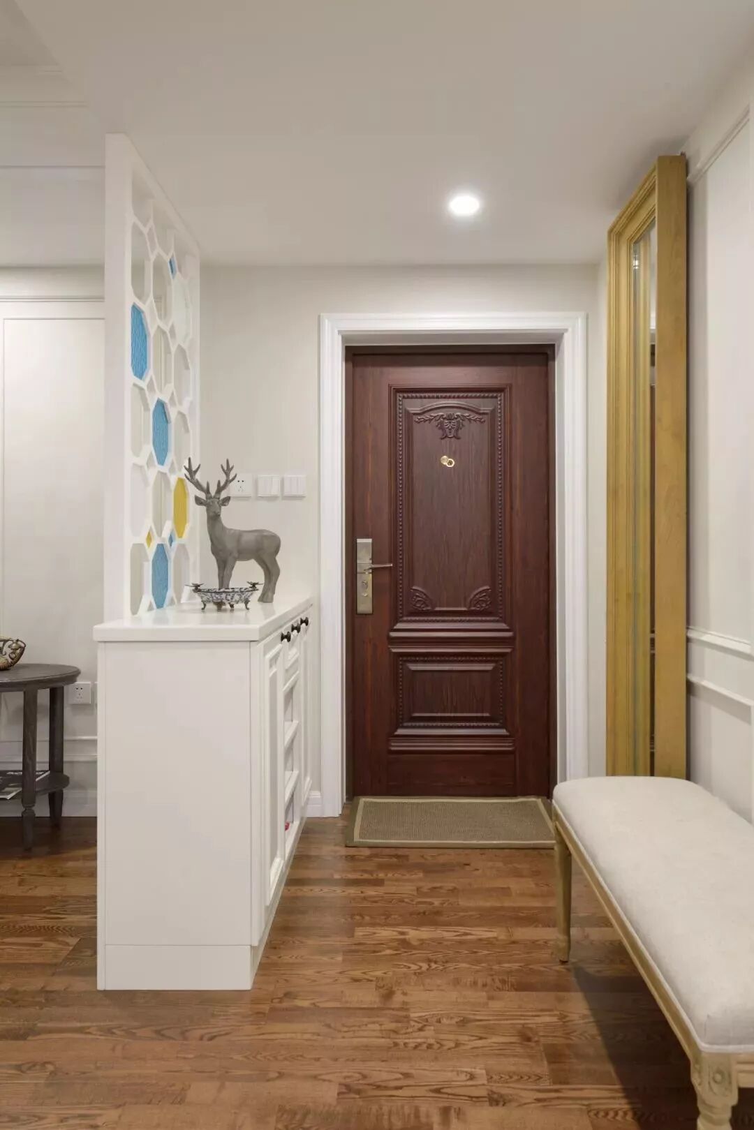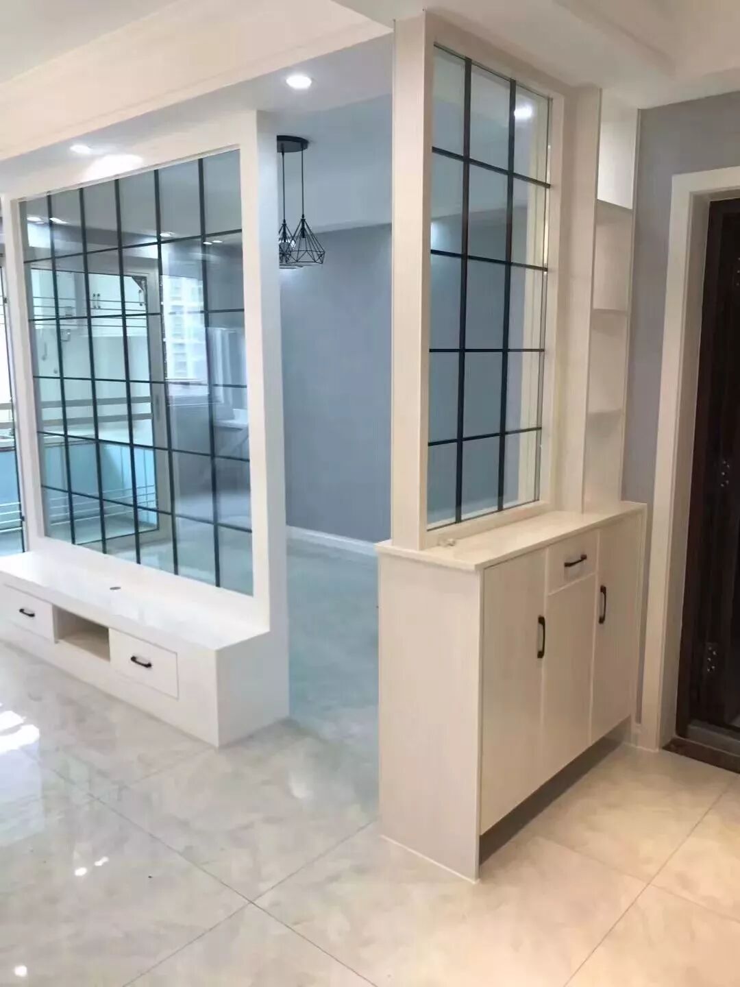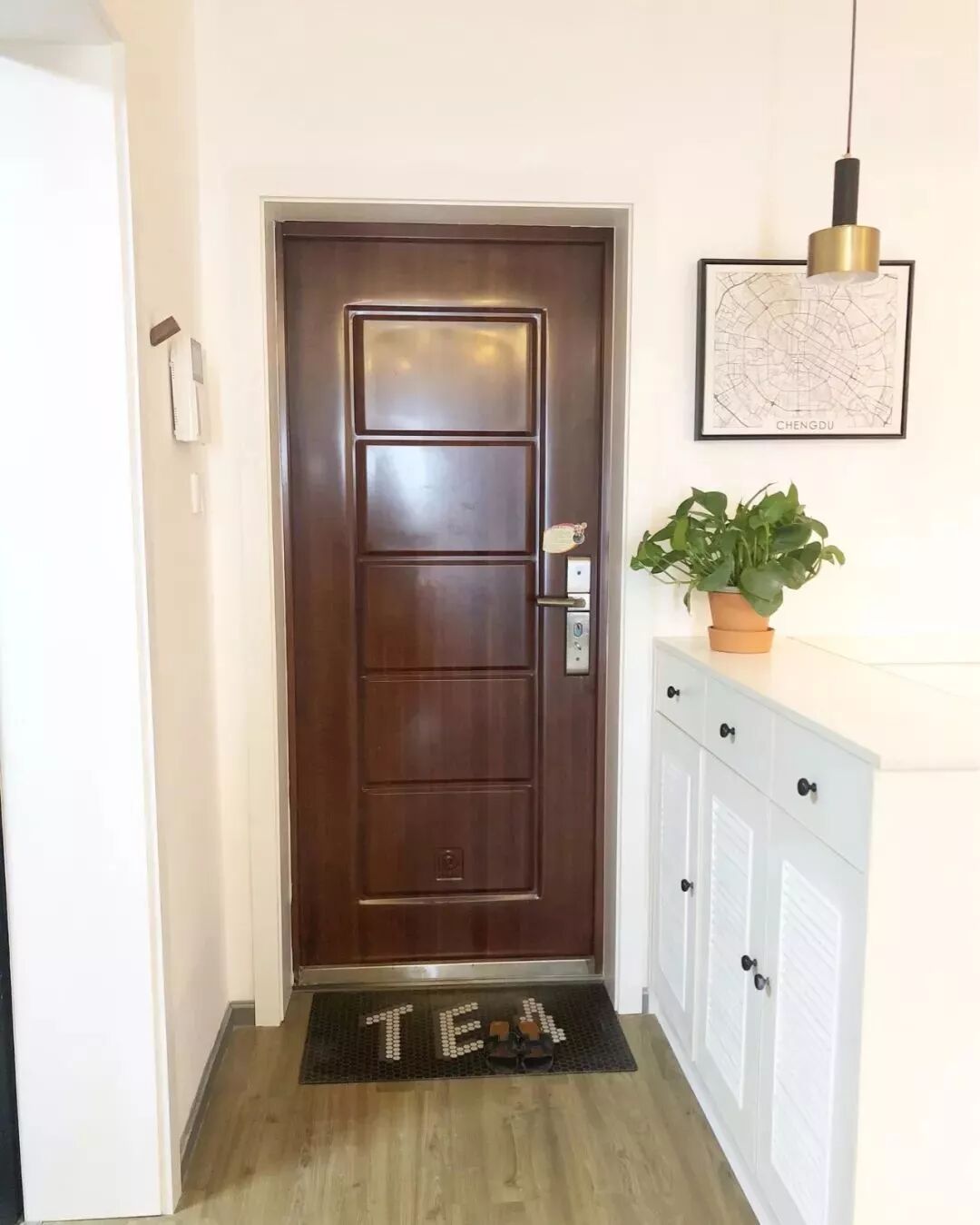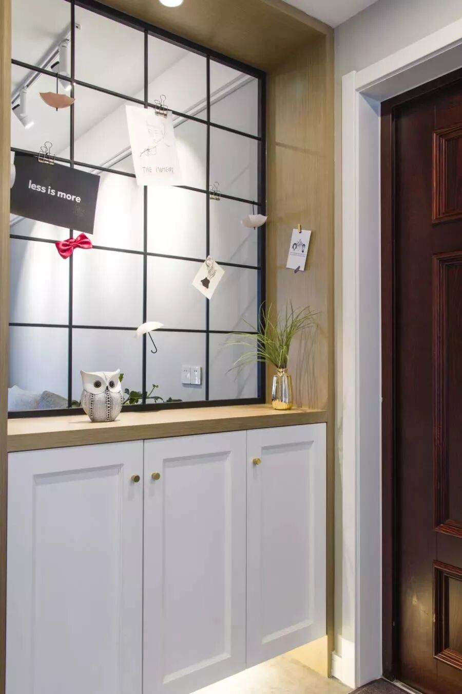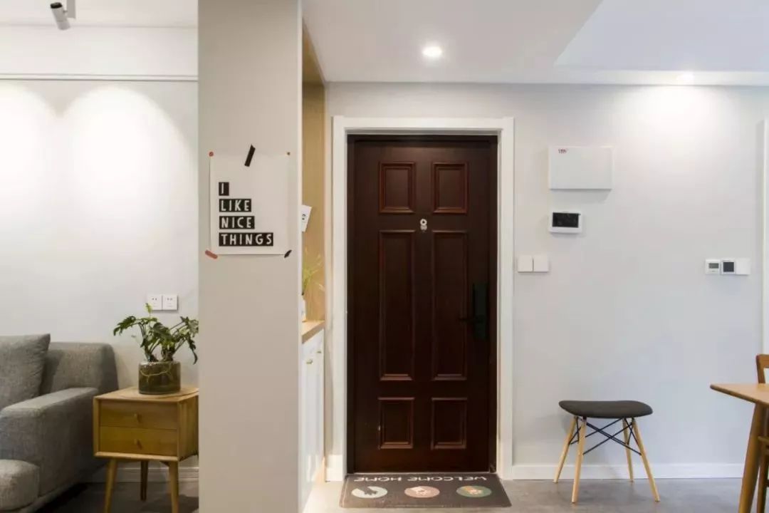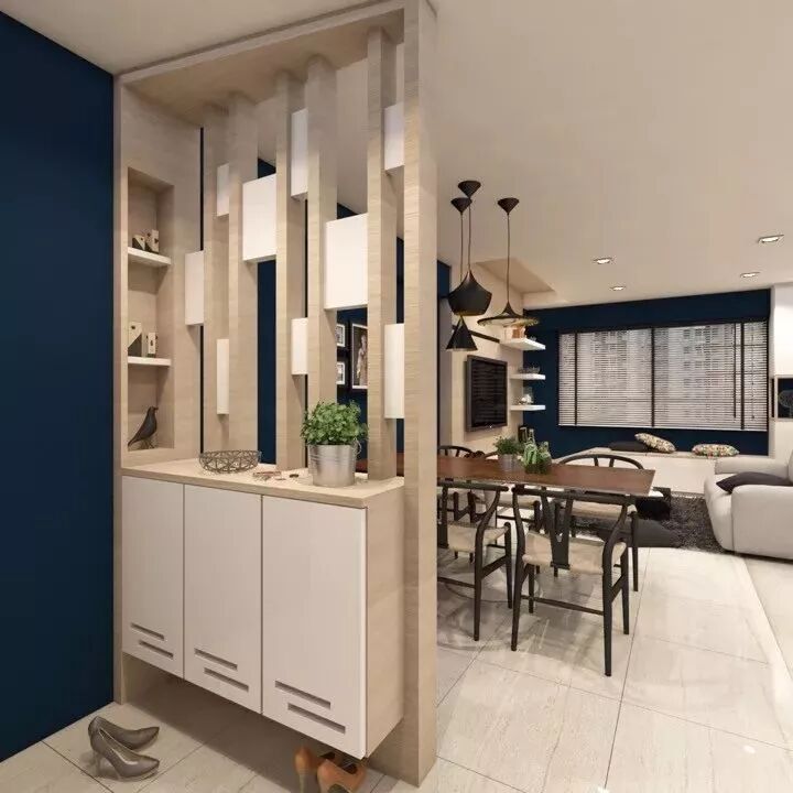 对于一进门就直对客厅或餐厅的户型,就可以在大门与客餐厅中间装个隔断+鞋柜组合的设计,增加空间的私密性,同时又增加了空间的收纳功能。